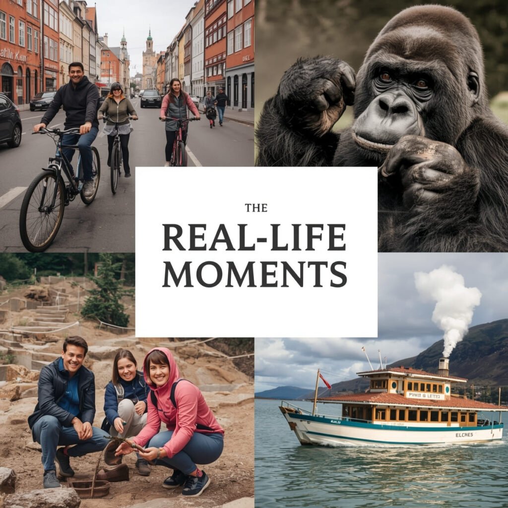 File name: green-destinations-2026-collage.jpg Description: Warm, inviting collage of real-life moments: cyclists in Copenhagen, a local guide in Rwanda with gorillas, geothermal pool in Iceland, family planting trees in Bhutan, electric boat in the Azores — all with happy travelers and locals together. Caption: Real people enjoying the greenest travel destinations on Earth in 2026.