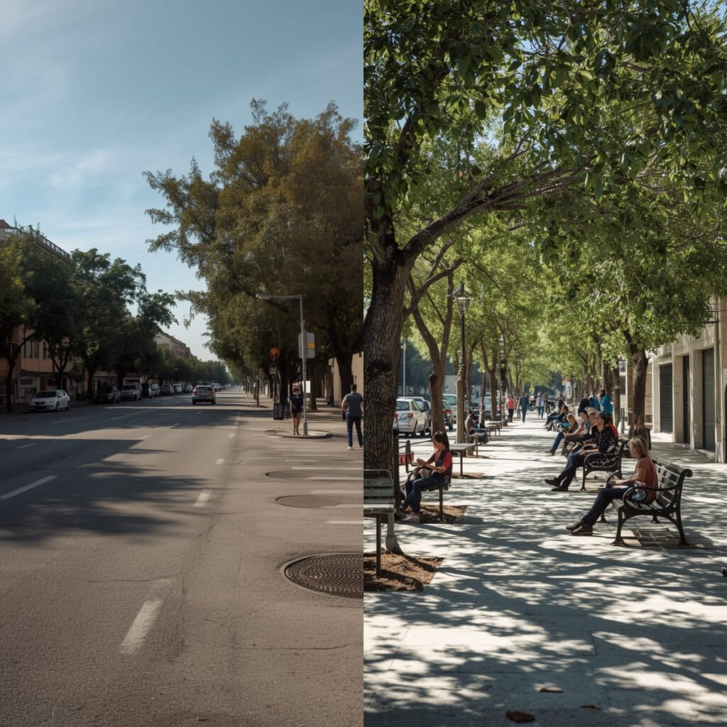 File name: urban-green-spaces-benefits-2026.jpg Description: Split image: left side shows a barren concrete street on a 40 °C day (heat shimmer, empty), right side shows the same street transformed with trees, benches, kids playing, people smiling — dramatic before/after effect. Caption: Same street, five years apart. Green spaces aren’t decoration — they’re transformation.
